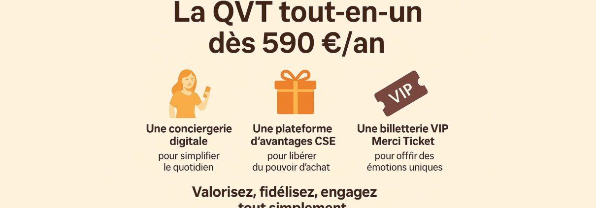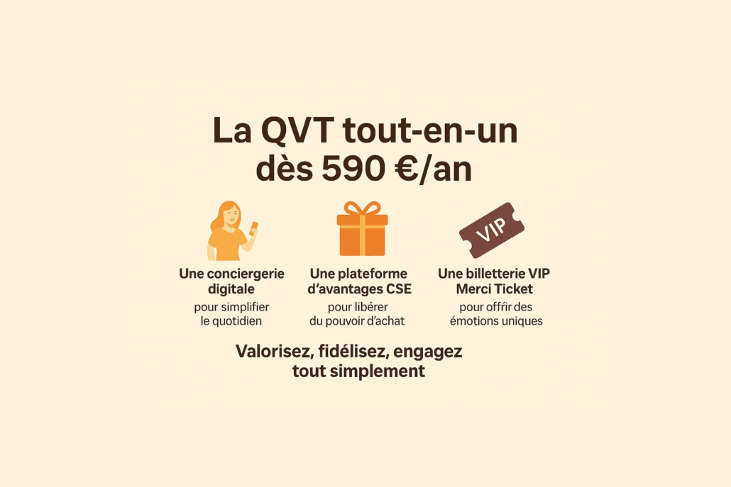 C’est précisément pour cela que Merci La Conciergerie a imaginé une offre QVT tout-en-un, pensée pour les TPE, PME et ETI.